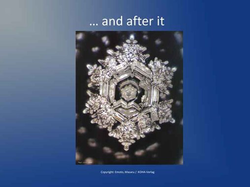 The following picture quotations from KOHA-Verlag show a small selection of fascinating photos of frozen water crystals, which show extreme context-related differences with the same distilled basic water: